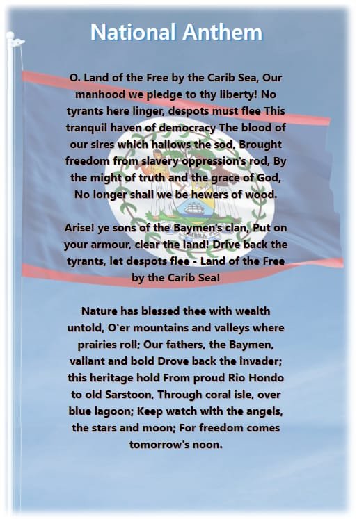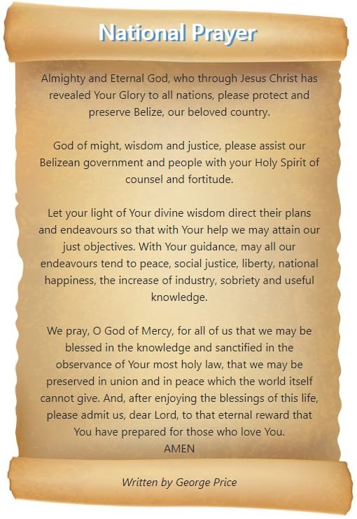 “May truth, peace, and kindness be yours to share with others, to uplift and quicken our Belizean values and to flourish and enhance our Central American land, the new Belize by the Carib Sea.”